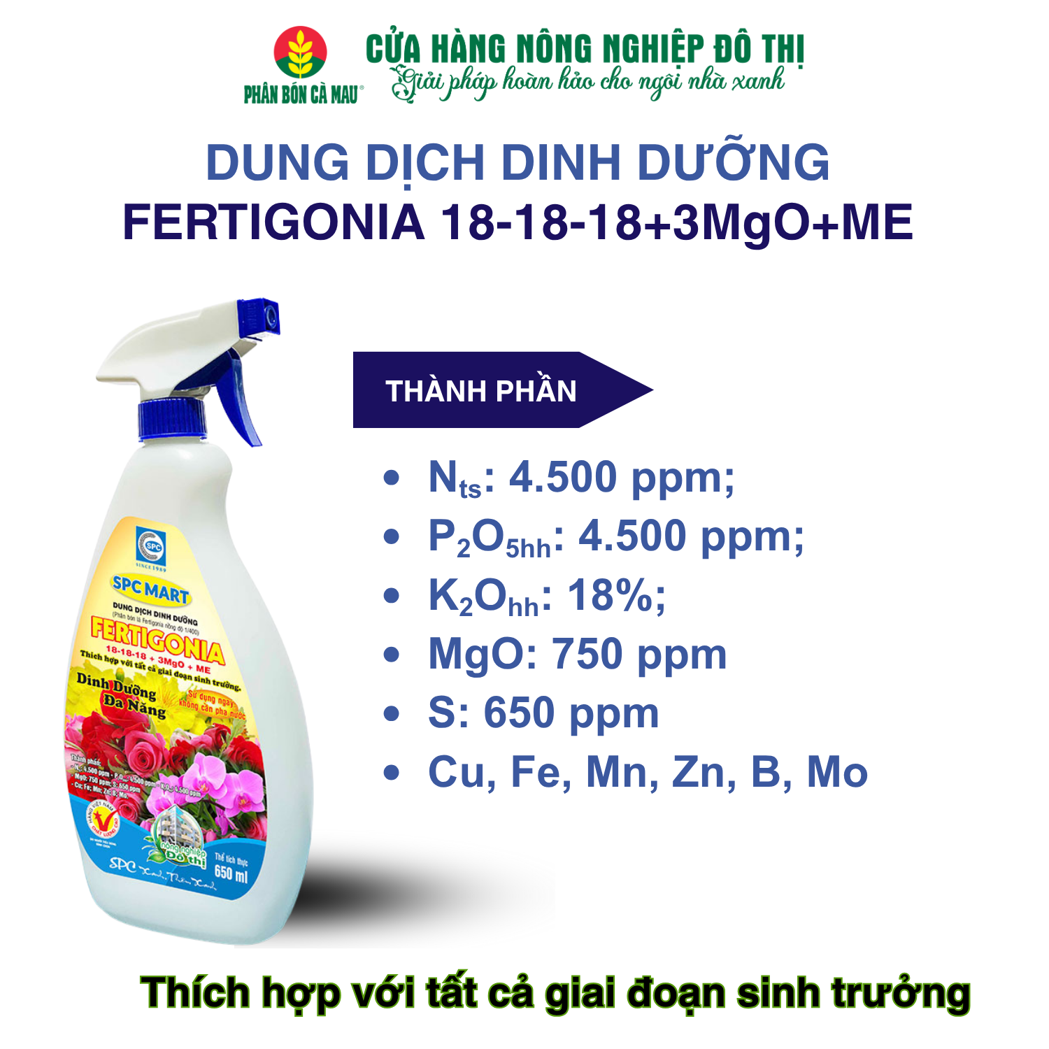– Thành phần: Nts: 4.500 ppm; P2O5: 4.500 ppm; K2O:4.500 ppm; MgO: 750 ppm; S: 650 ppm; ME: Cu, Fe, Mn, Zn, B, Mo.
