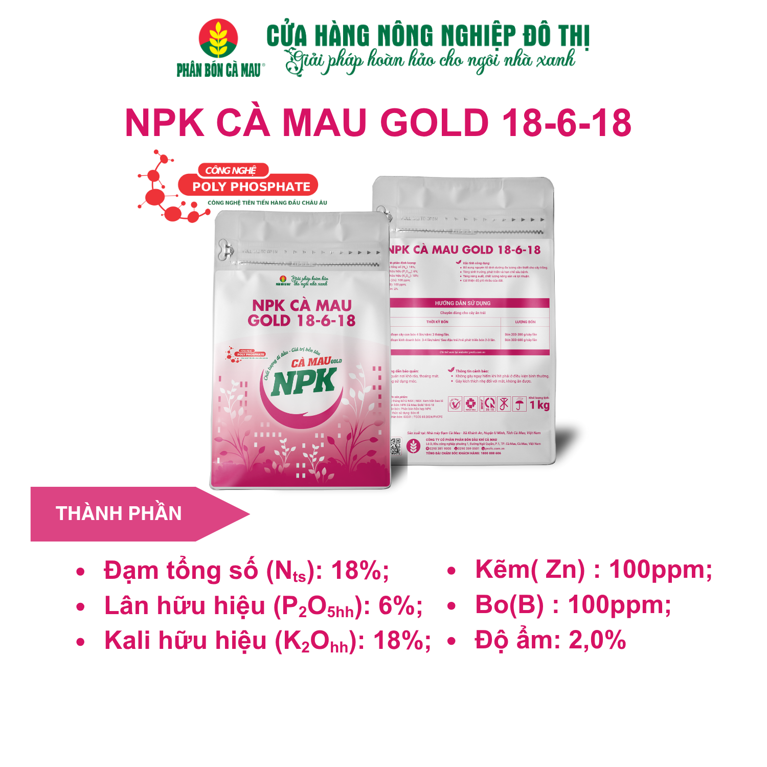 – Thành phần: Đạm tổng số (Nts): 18%; Lân hữu hiệu (P2O5hh):6%; Kali hữu hiệu (K2Ohh): 18%;Kẽm (Zn): 100 ppm; Bo (B): 100 ppm; Độ ẩm: 2,0 %.