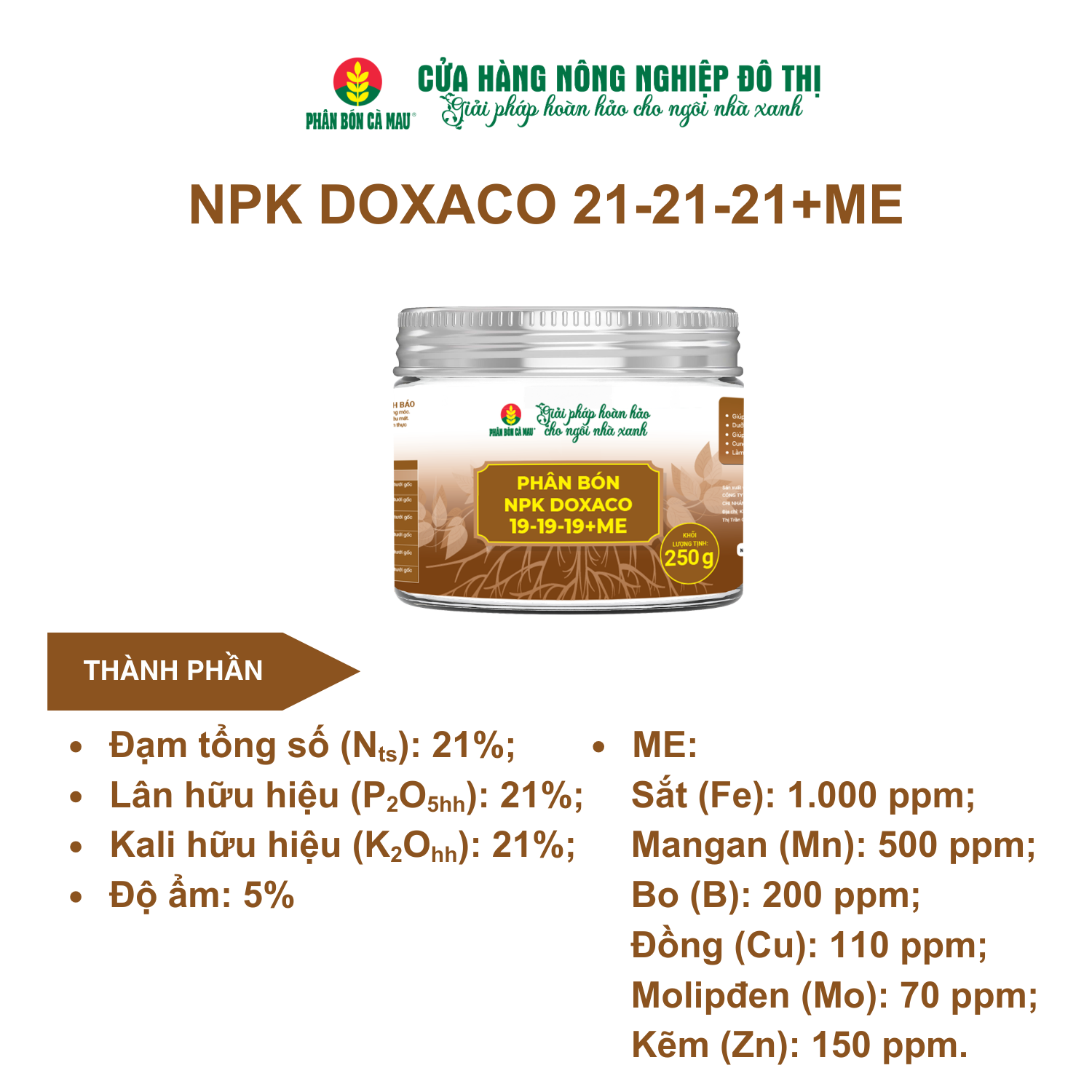 – Thành phần: Đạm tổng số (Nts): 19%; Lân hữu hiệu (P2O5hh):19%; Kali hữu hiệu (K2Ohh): 19%; ME: Sắt (Fe): 1.000 ppm, Mangan (Mn): 500 ppm; Bo (B): 200 ppm; Đồng (Cu): 110 pmm; Molipđen (Mo): 70 ppm, Kẽm ( Zn): 150 ppm; Độ ẩm: 5,0 %